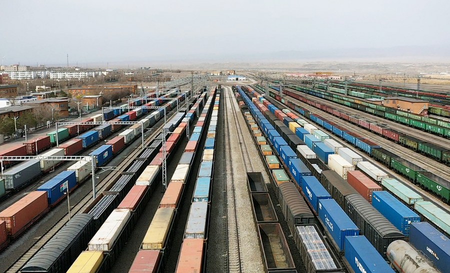 Aerial photo taken on April 11, 2020 shows cargos to be exported in Alataw Pass, northwest China's Xinjiang Uygur Autonomous Region. (Xinhua/Sadat)