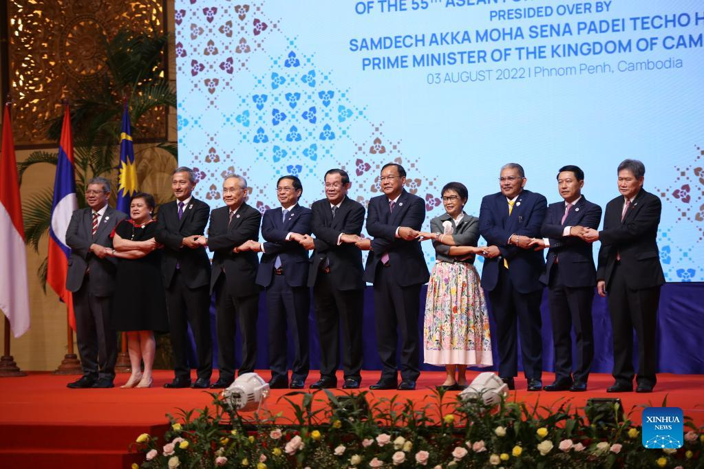 Attendees of the 55th ASEAN (the Association of Southeast Asian Nations) Foreign Ministers' Meeting pose for a group photo in Phnom Penh, Cambodia, on Aug. 3, 2022. The 55th ASEAN Foreign Ministers' Meeting and related meetings kicked off here on Wednesday, with a focus on post-COVID-19 pandemic recovery and key regional and global challenges. (Photo by Ly Lay/Xinhua)