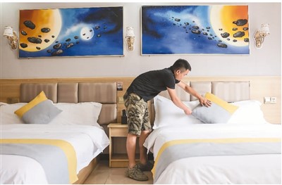 Homestay owner Liu Chengliang, who is now 32 years old, makes up beds at his homestay in Kedu township of Pingtang county, southwest China’s Guizhou Province. (Xinhua/Ou Dongqu)