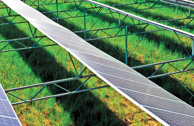Photo shows lush green grass that has recently taken root underneath the solar panels inside a photovoltaic power industrial park. (Photo/People’s Daily)