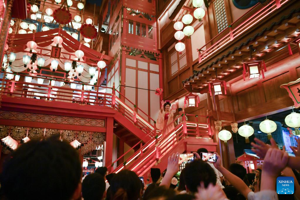 A performer throws an embroidery ball to tourists on the occasion of Qixi Festival in Qujiang New District in Xi'an, northwest China's Shaanxi Province, Aug. 4, 2022. The Qixi Festival, or Chinese Valentine's Day, falls on Aug. 4 this year. (Xinhua/Zhang Bowen)