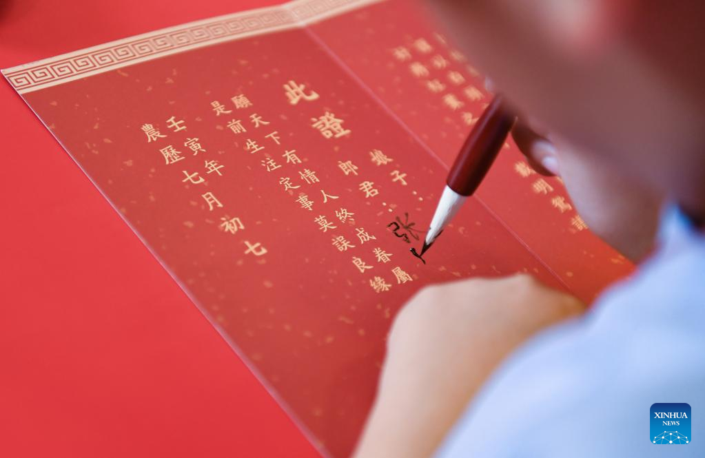 A tourist writes a "marriage certificate" on the occasion of Qixi Festival in Qujiang New District in Xi'an, northwest China's Shaanxi Province, Aug. 4, 2022. The Qixi Festival, or Chinese Valentine's Day, falls on Aug. 4 this year. (Photo by Zou Jingyi/Xinhua)