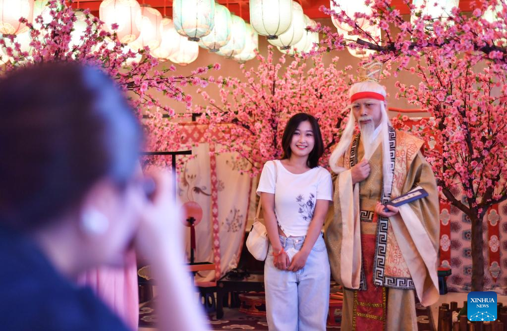 A tourist poses for a photo with a performer of "Yuelao", a god of marriage and love in Chinese mythology, on the occasion of Qixi Festival in Qujiang New District in Xi'an, northwest China's Shaanxi Province, Aug. 4, 2022. The Qixi Festival, or Chinese Valentine's Day, falls on Aug. 4 this year. (Xinhua/Zhang Bowen)