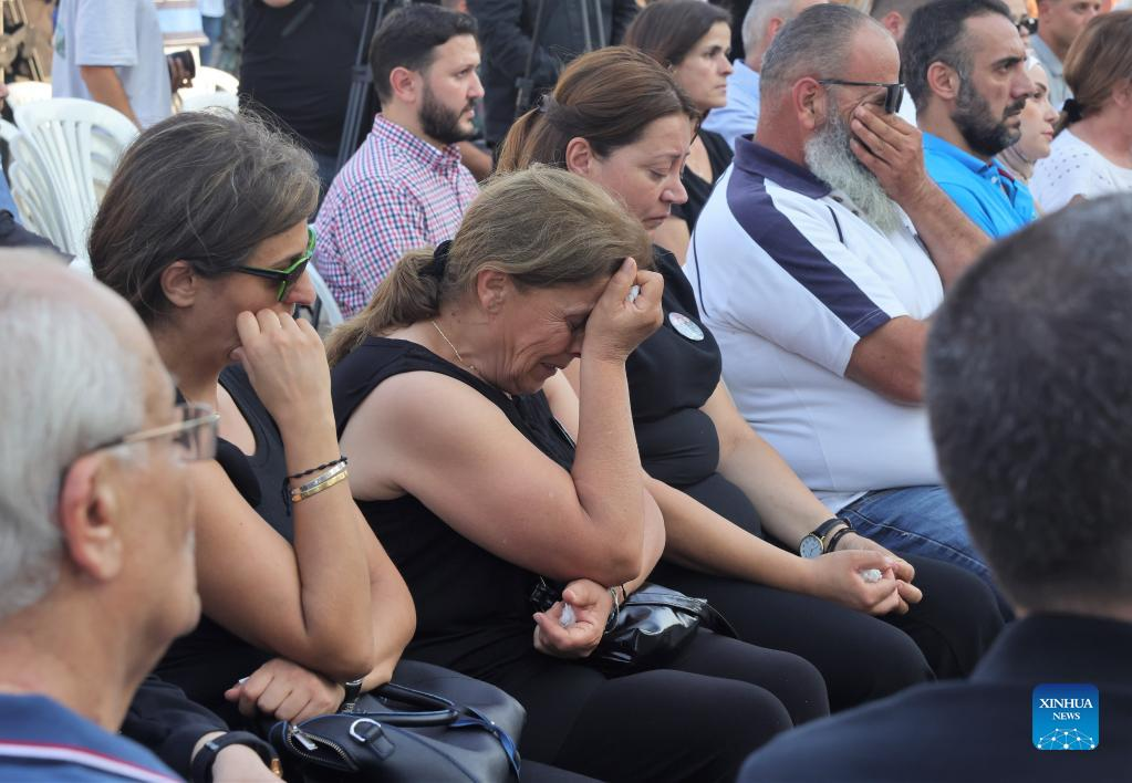 People participate in a memorial event held at the Beirut Fire Brigade's headquarters in Beirut, Lebanon, on Aug. 3, 2022. The Beirut Fire Brigade held a memorial event on Wednesday to pay tribute to the firefighters who lost their lives in Beirut port explosion on Aug. 4, 2020. (Xinhua/Liu Zongya)