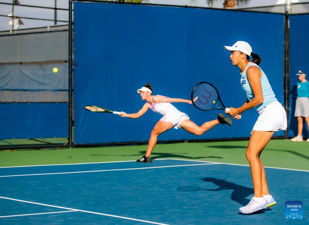 Zhang Shuai (R)/Veronika Kudermetova compete during the women's doubles quarterfinal against Caroline Dolehide/Storm Sanders at the 2022 Mubadala Silicon Valley Classic in San Jose, California, the United States, Aug. 4, 2022. (Photo by Arthur Dong/Xinhua)