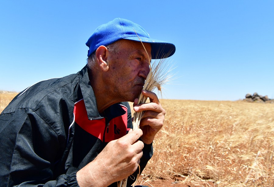Nayef Saymoua, a 62-year-old farmer, smells ears of wheat in a wheat field in Syria's southern province of Sweida, July 2, 2022. (Photo by Ammar Safarjalani/Xinhua)