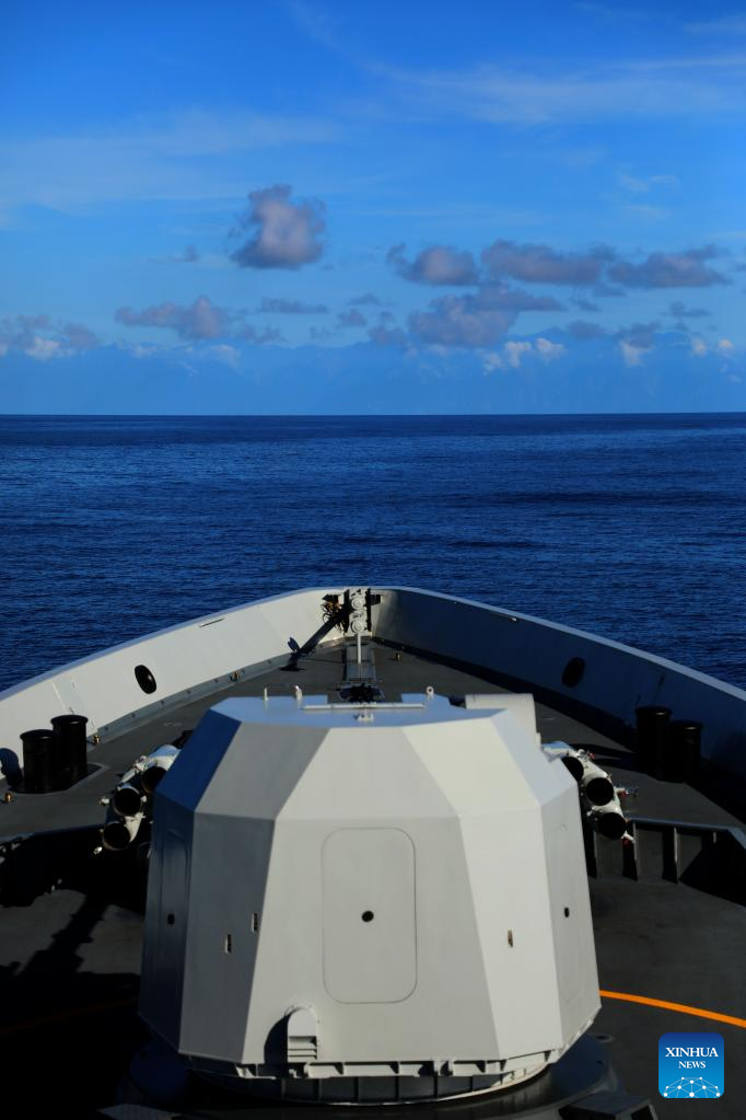 A warship of the navy of the Eastern Theater Command of the Chinese People's Liberation Army (PLA) conducts operations during joint combat exercises and training around the Taiwan Island, Aug. 6, 2022. The Command continued its joint combat exercises and training as scheduled on Saturday in the waters and airspace around the Taiwan Island. The Command tested its capabilities for striking targets on land and sea with the support of an integrated military system. (Photo by Lin Jian/Xinhua)