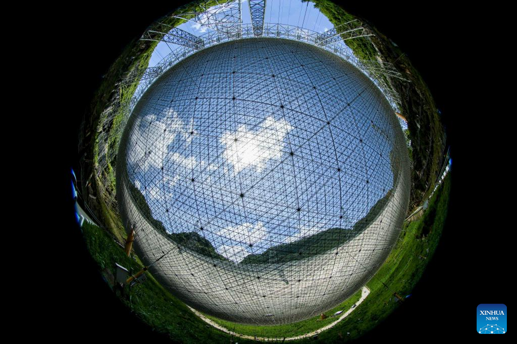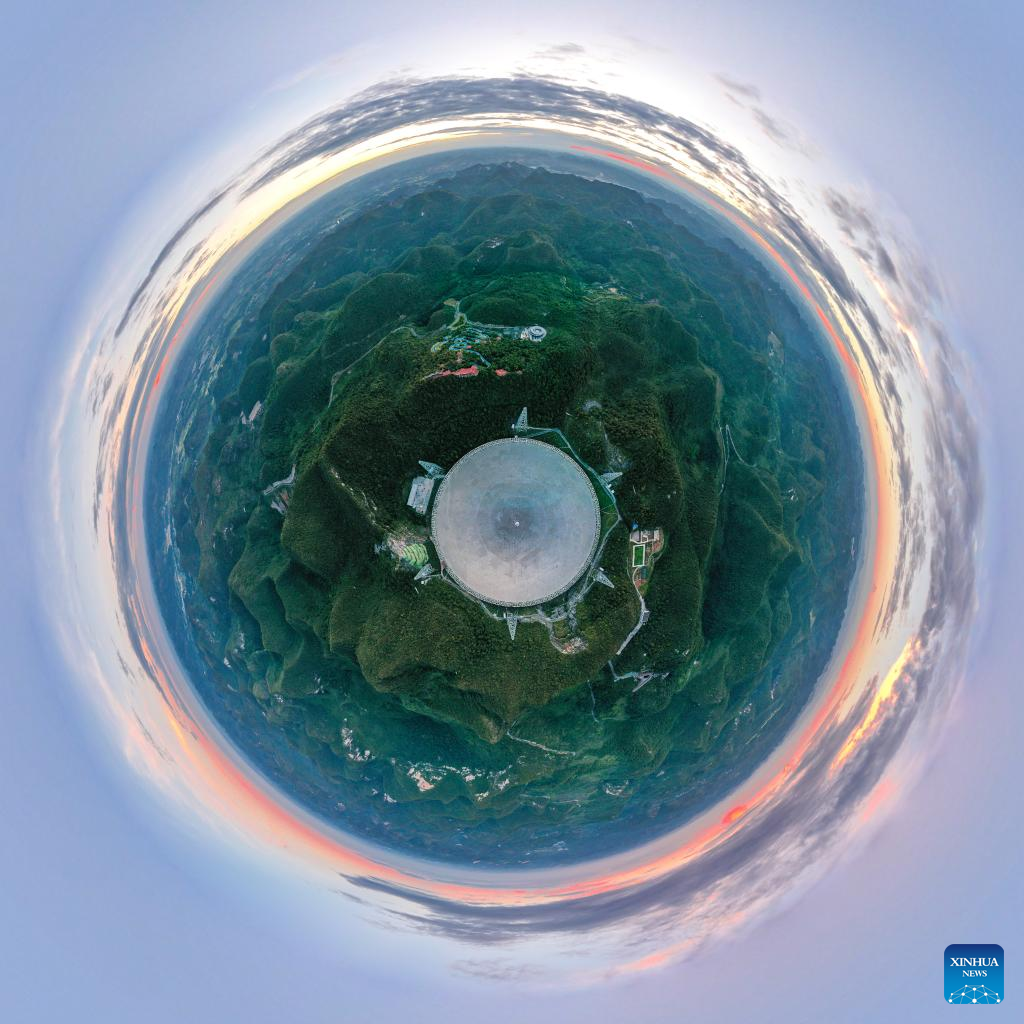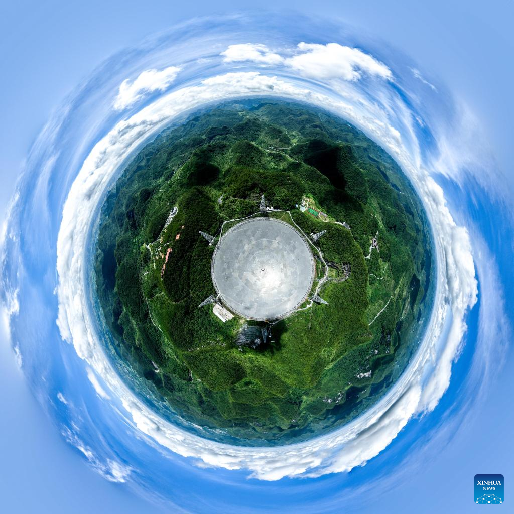 Aerial panoramic photo taken on July 21, 2022 shows China's Five-hundred-meter Aperture Spherical Radio Telescope (FAST) under maintenance in southwest China's Guizhou Province. Located in a naturally deep and round karst depression in southwest China's Guizhou Province, FAST started formal operation in January 2020 and officially opened to the world on March 31, 2021. It is believed to be the world's most sensitive radio telescope. With FAST, scientists have identified over 660 new pulsars. (Xinhua/Ou Dongqu)