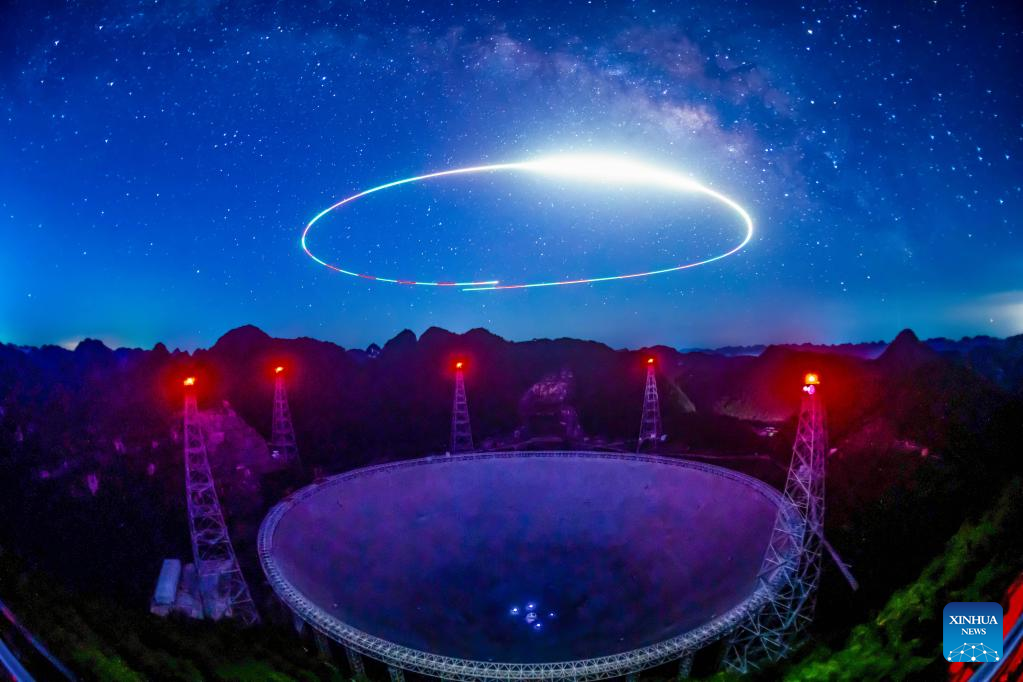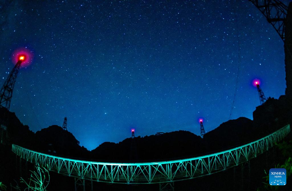 The long-time exposure photo taken on July 25, 2022 shows a night view of China's Five-hundred-meter Aperture Spherical Radio Telescope (FAST) under maintenance in southwest China's Guizhou Province.