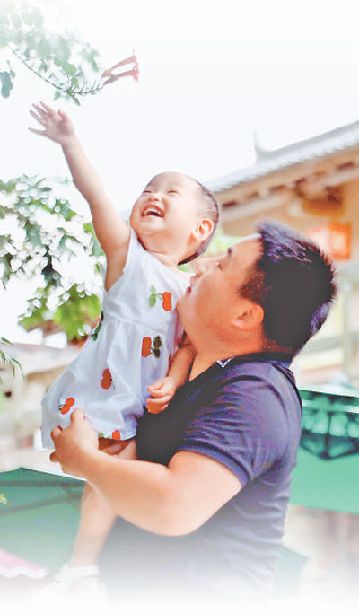 Photo taken on Aug. 3, 2022 shows a tourist and his daughter in a scenic area in Zhujiawan village, Zhashui county of Shangluo city, northwest China’s Shaanxi Province. (People’s Daily/Wu Kai)