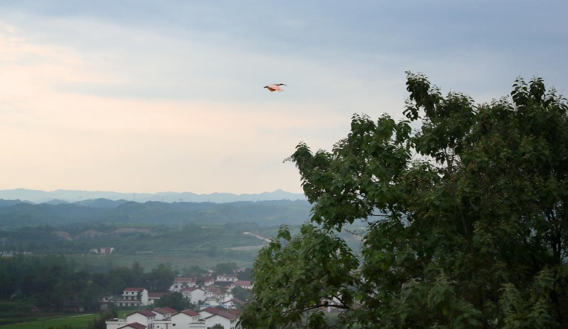 A crested ibis flies over a village in Yangxian county, Hanzhong, northwest China's Shaanxi province, Aug. 1, 2020. (People's Daily Online/Xu Congjun)