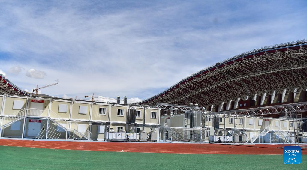 Photo taken on Aug. 9, 2022 shows a makeshift hospital built at a sports center in Lhasa, southwest China's Tibet Autonomous Region. Tibet Autonomous Region has built three makeshift hospitals in the cities of Lhasa, Xigaze and Qamdo to accommodate asymptomatic carriers of COVID-19 and those with mild symptoms. (Xinhua/Jigme Dorje)