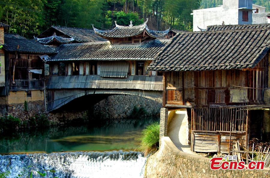 File photo shows the Sanxian wooden-roofed arch bridge in Hexi village of Chunchi town, Zhouning county, Ningde, east China's Fujian Province. (Photo: China News Service/Li Hongyuan)