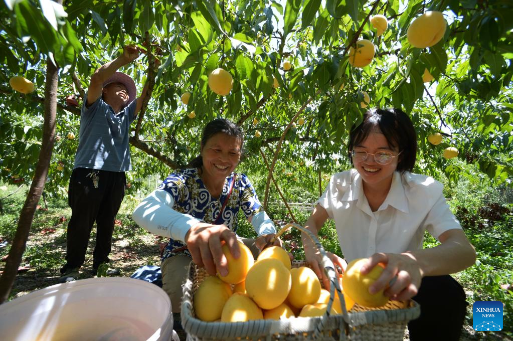 Villagers sell peaches in Banxi Village of Tonglin Town in Qiandongnan Miao and Dong Autonomous Prefecture, southwest China's Guizhou Province, Aug. 10, 2022. Villagers in Banxi Village are busying harvesting fruits such as peaches, pears and plums amid the harvest season. (Xinhua/Yang Ying)