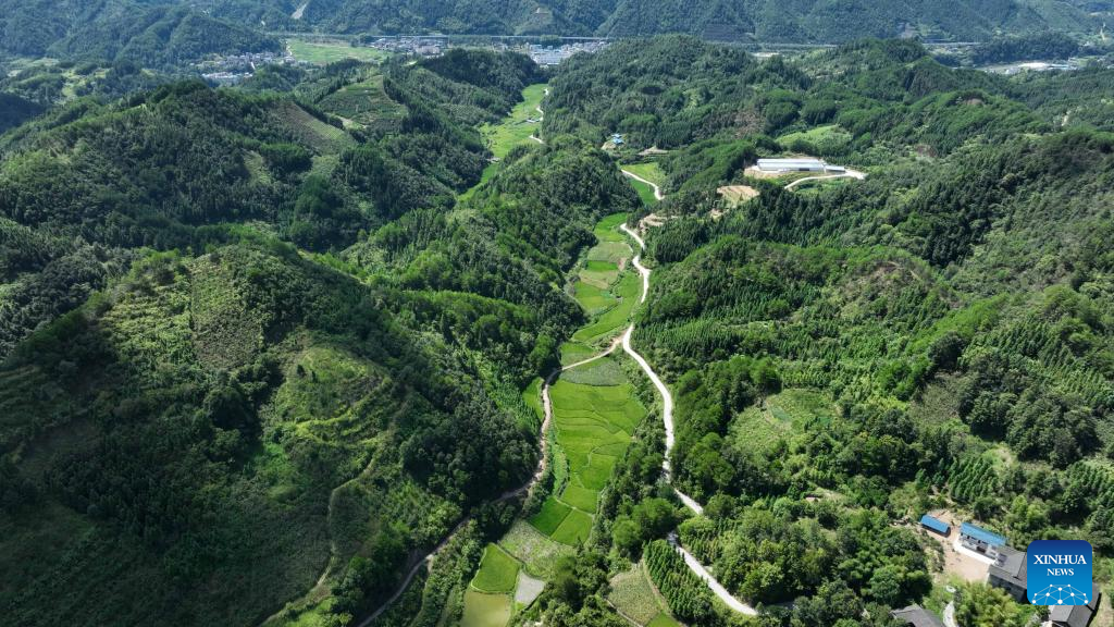 Aerial photo taken on Aug. 10, 2022 shows a fruit planting base in Banxi Village of Tonglin Town in Qiandongnan Miao and Dong Autonomous Prefecture, southwest China's Guizhou Province. Villagers in Banxi Village are busying harvesting fruits such as peaches, pears and plums amid the harvest season. (Xinhua/Yang Ying)