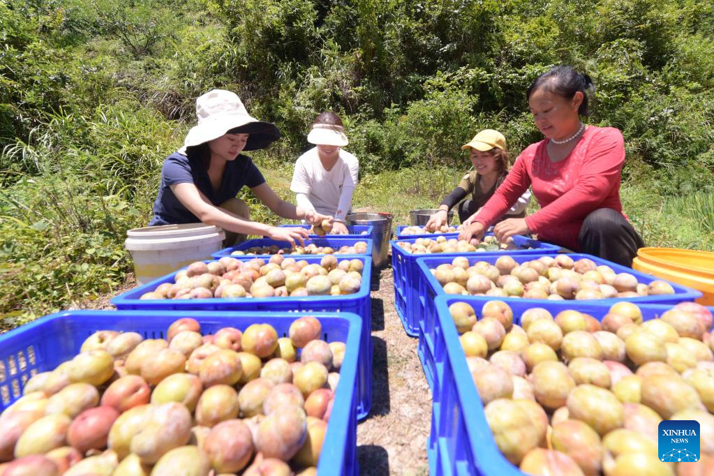 Villagers sort peaches in Banxi Village of Tonglin Town in Qiandongnan Miao and Dong Autonomous Prefecture, southwest China's Guizhou Province, Aug. 10, 2022. Villagers in Banxi Village are busying harvesting fruits such as peaches, pears and plums amid the harvest season. (Xinhua/Yang Ying)