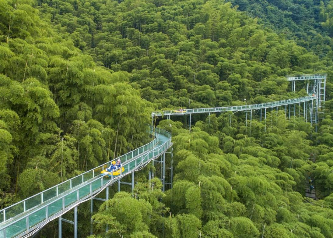 Tourists experience water slide over a bamboo forest in Shangshu township, Anji county, Huzhou, east China's Zhejiang province, July 27, 2022. (People's Daily Online/Xia Pengfei)