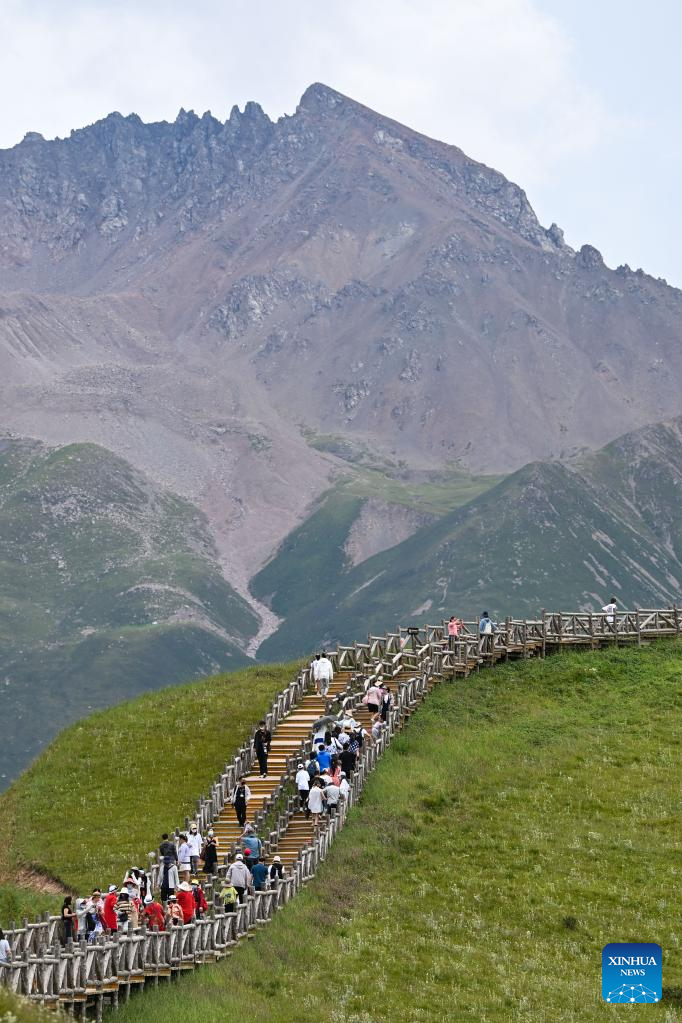 Tourists visit Zhuo'er Mountain scenic area in Qilian County of Haibei Tibetan Autonomous Prefecture, northwest China's Qinghai Province, Aug. 10, 2022. (Xinhua/Zhang Long)