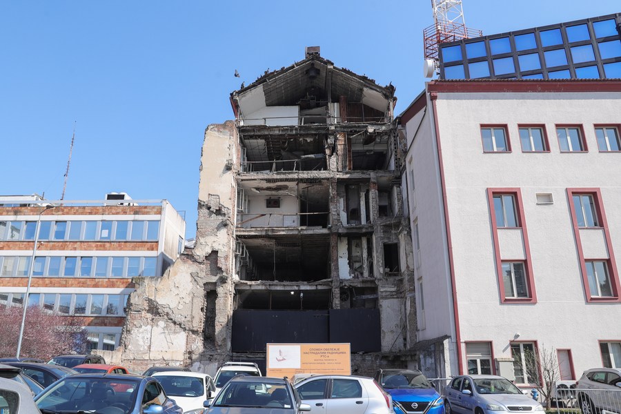 The bombed Radio Television Serbia (RTS) building is seen in Belgrade, Serbia, March 21, 2022. In Belgrade, there are many scars left by the NATO bombings. (Xinhua/Zheng Huansong)