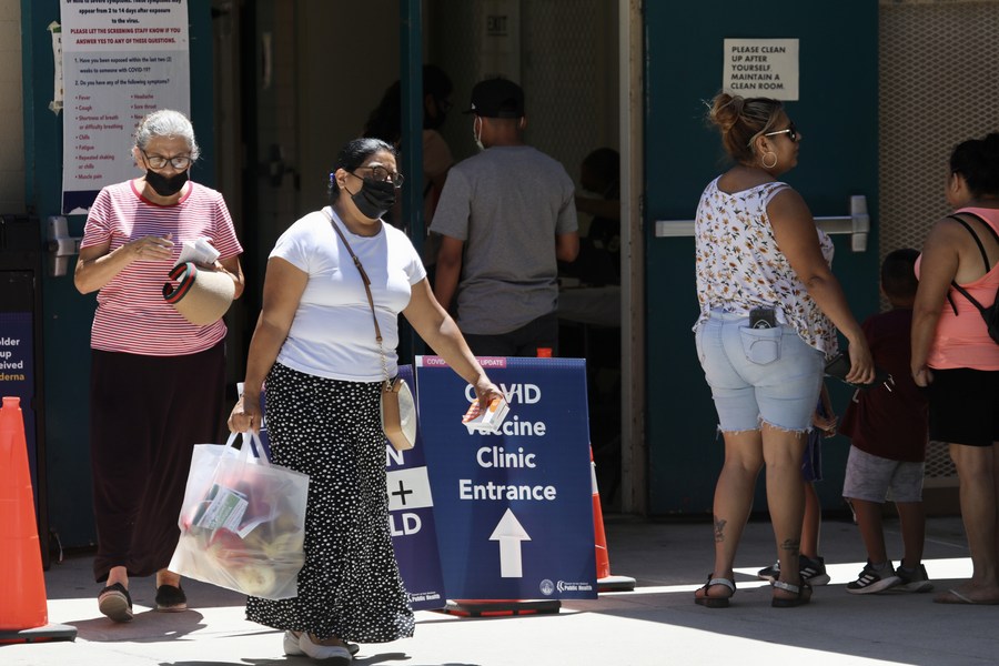 People wearing face masks are seen at a COVID-19 vaccine clinic in Los Angeles, California, the United States, on Aug. 5, 2022. (Xinhua)