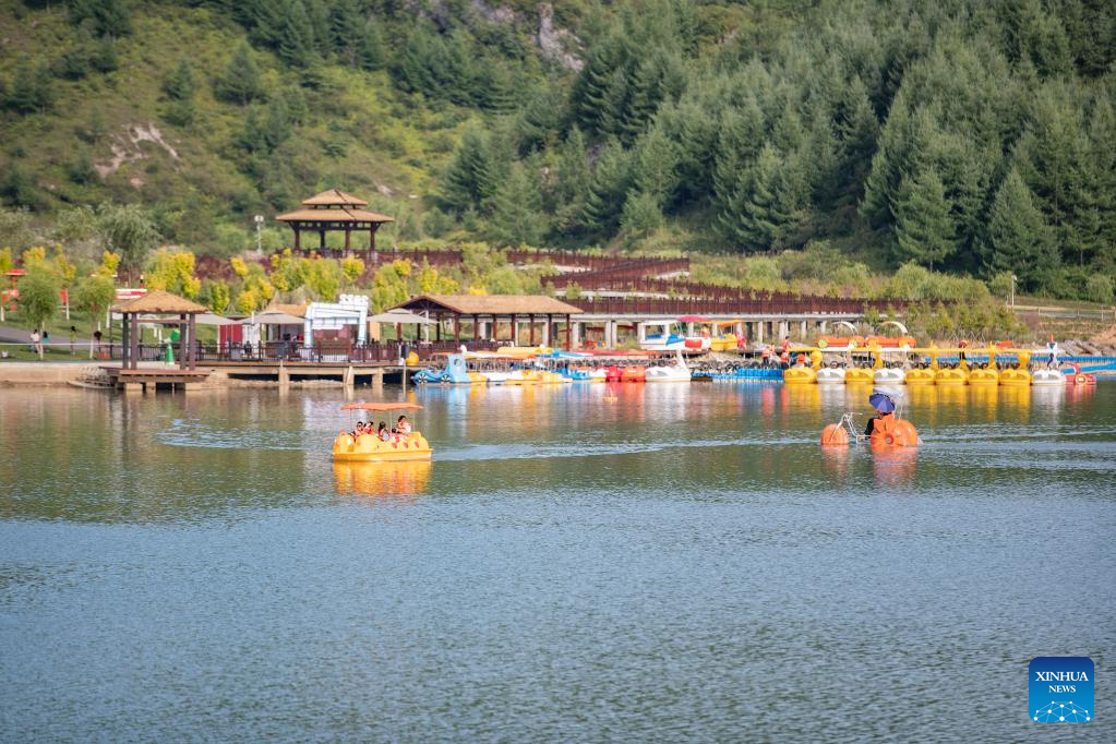 Tourists go boating in Hongchiba scenic area in Wuxi County of southwest China's Chongqing, Aug. 10, 2022.