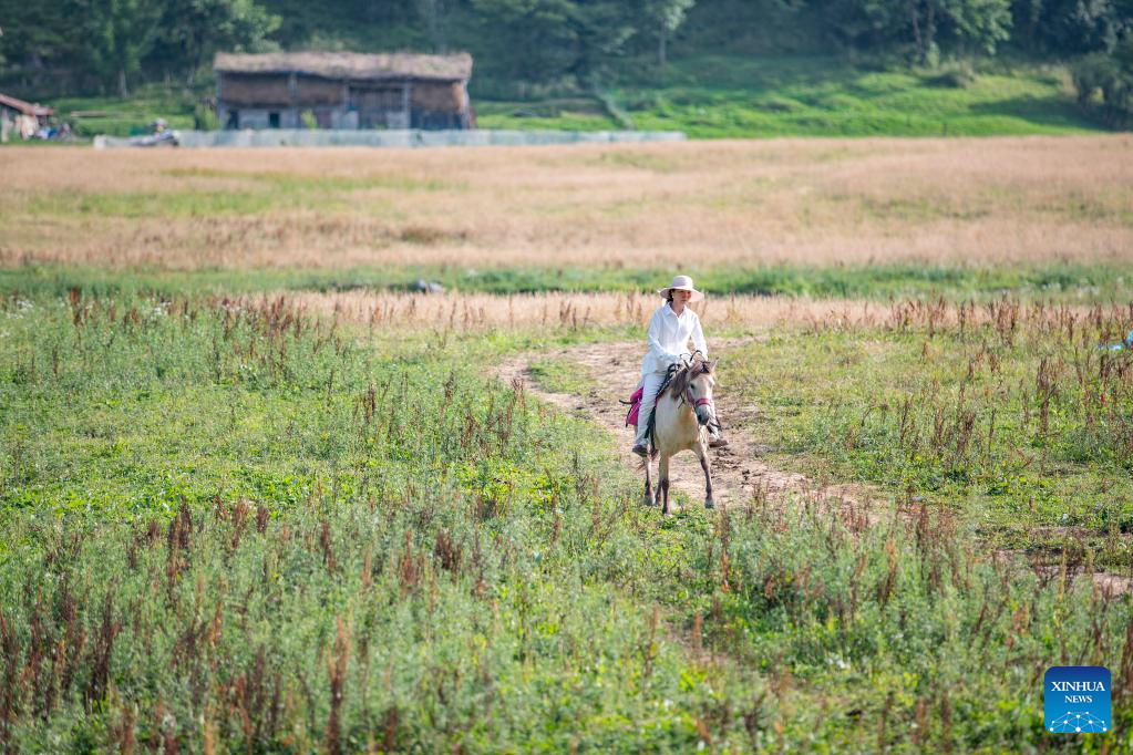 A tourist rides a horse in Hongchiba scenic area in Wuxi County of southwest China's Chongqing, Aug. 10, 2022.