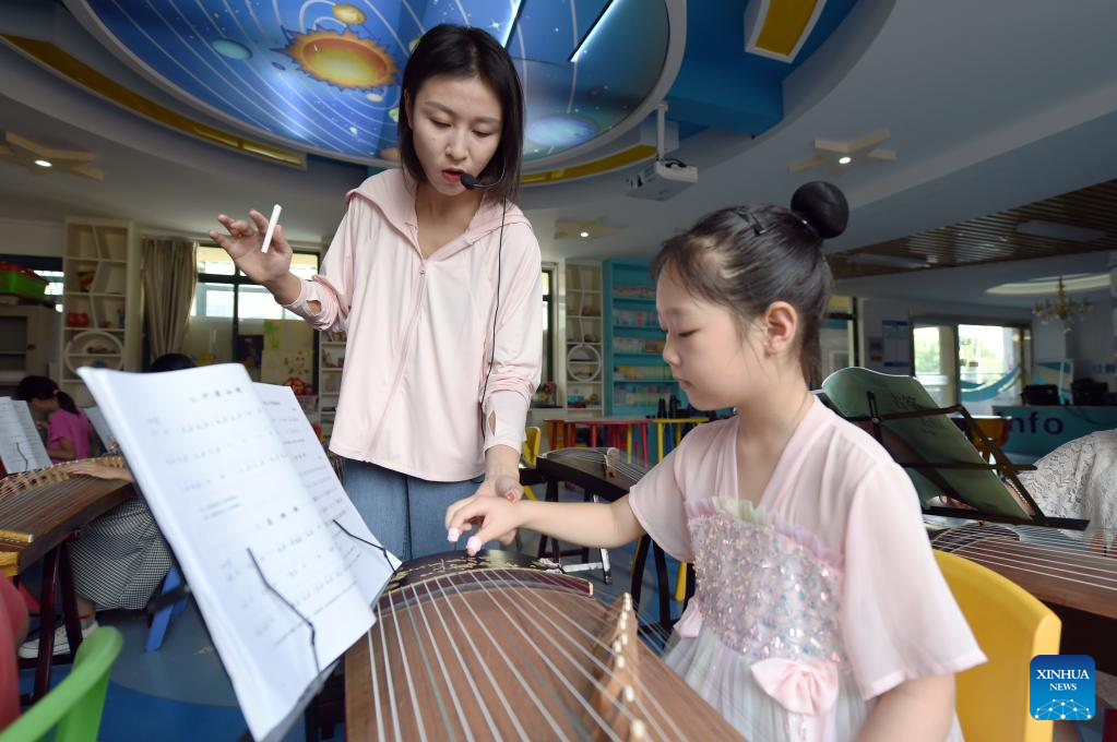 Students learn to play guzheng, or Chinese zither, in Hefei, east China's Anhui Province, Aug. 10, 2022.