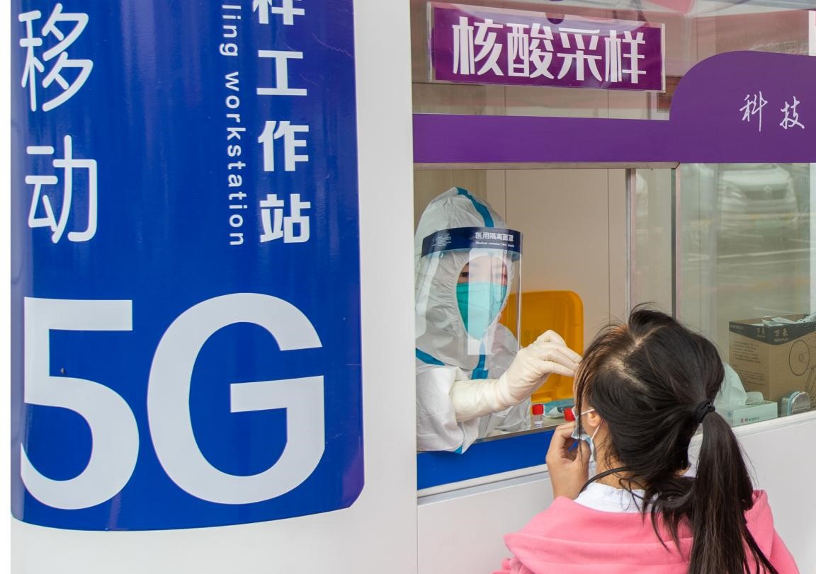 A medical worker collects a swab sample from a girl at a nucleic acid testing site in Jiangdong township, Jinhua, east China's Zhejiang Province, May 16, 2022. The application of a high-speed 5G network has enabled the testing site to have residents' information automatically input into the computer system by scanning their health codes. The whole sampling process for each person can be completed in less than 20 seconds. (People's Daily Online/Yang Meiqing)