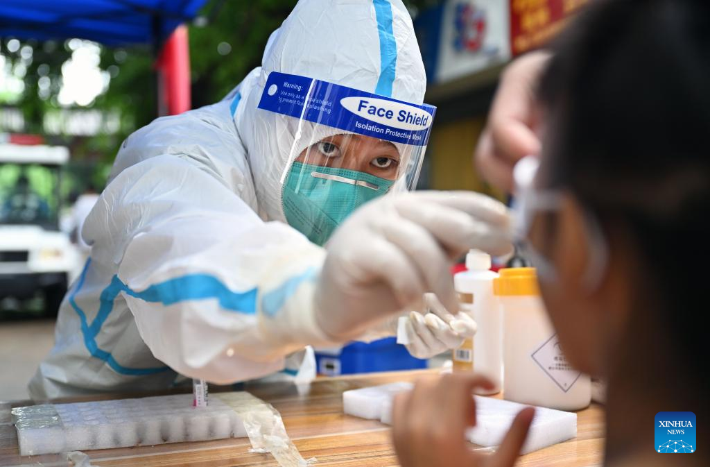 Yuan Qingyi, a medical worker from central China's Henan Province, takes a swab sample from a resident for nucleic acid testing in Sanya, south China's Hainan Province, Aug. 11, 2022. Medics from across China have joined the fight against the recent COVID-19 resurgence in Sanya, a coastal resort city in Hainan Province. (Xinhua/Guo Cheng)
