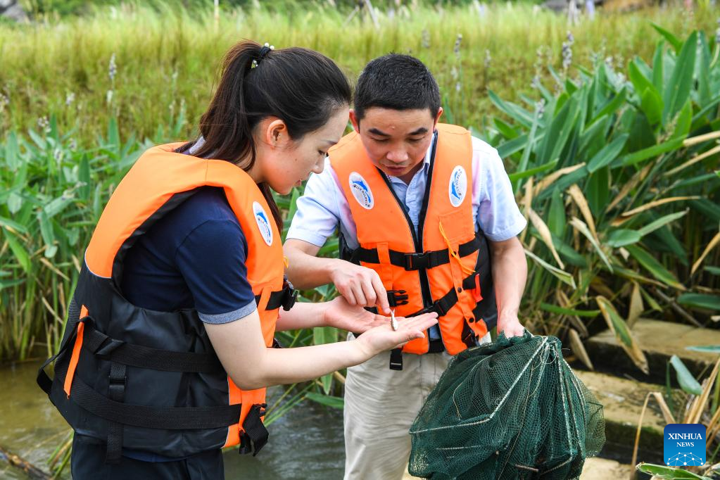 Researchers check fish fry at the Dateng Gorge water conservancy project in Guiping City, south China's Guangxi Zhuang Autonomous Region, Aug. 10, 2022.