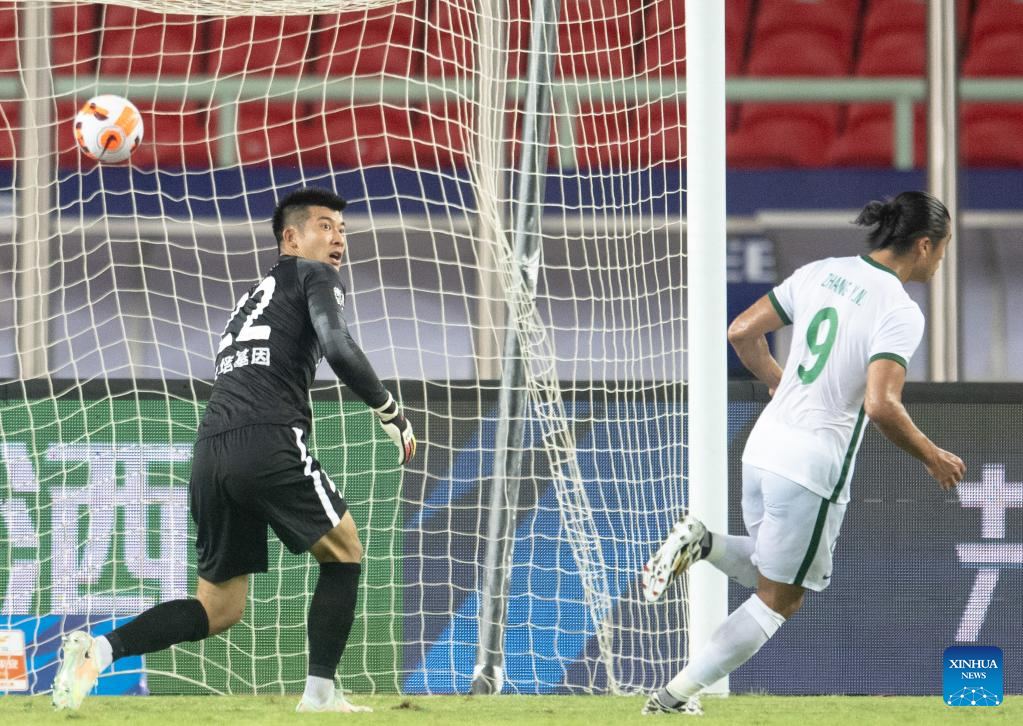 Zhang Yuning (R) of Beijing Guoan scores a goal during a 2022 season Chinese Football Association Super League (CSL) match between Wuhan Three Towns and Beijing Guoan in Wuhan, central China's Hubei Province, Aug. 12, 2022. (Xinhua/Xiao Yijiu)