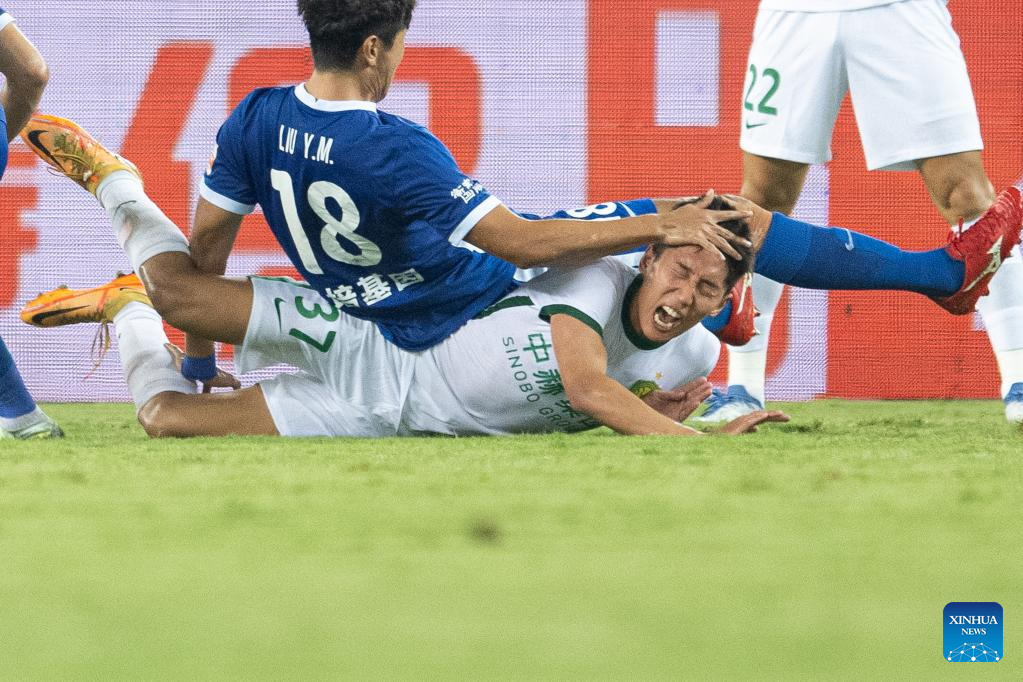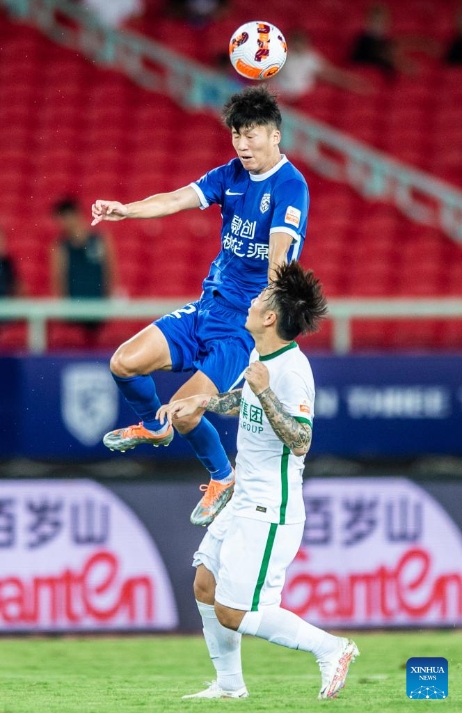 Liu Yiming (top) of Wuhan Three Towns vies with Cao Yongjing of Beijing Guoan during a 2022 season Chinese Football Association Super League (CSL) match between Wuhan Three Towns and Beijing Guoan in Wuhan, central China's Hubei Province, Aug. 12, 2022. (Xinhua/Xiao Yijiu)