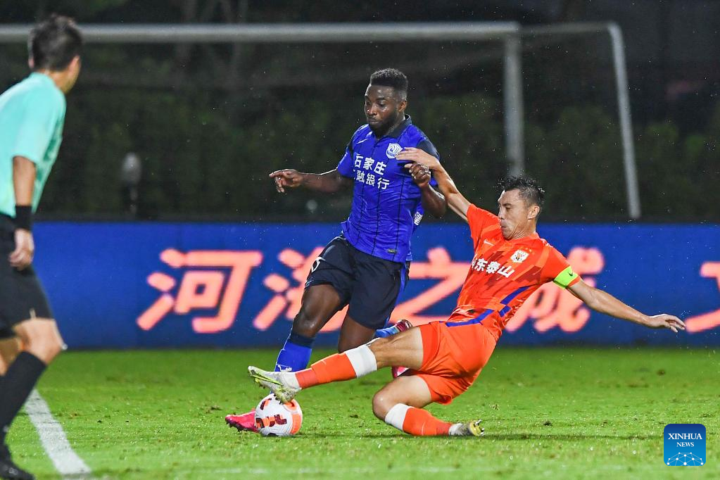 Oscar Maritu (L) of Cangzhou Mighty Lions competes with Zheng Zheng of Shandong Taishan during a 2022 season Chinese Football Association Super League (CSL) match between Shandong Taishan and Cangzhou Mighty Lions in Haikou, south China's Hainan Province, Aug. 12, 2022. (Xinhua/Hu Zhixuan)