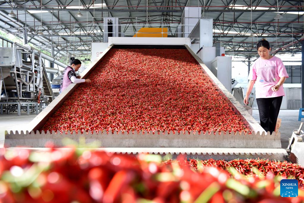 Workers work at a chili peppers processing factory in Wantanhe Township, Longli County, southwest China's Guizhou Province, Aug. 11, 2022. (Photo by Long Yi/Xinhua)