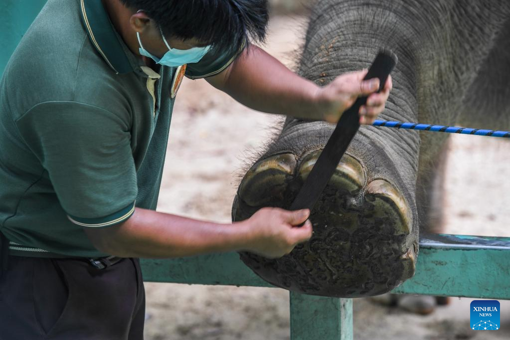 A breeder checks an Asian elephant's foot at Chimelong Safari Park in Guangzhou, south China's Guangdong Province, Aug. 12, 2022.