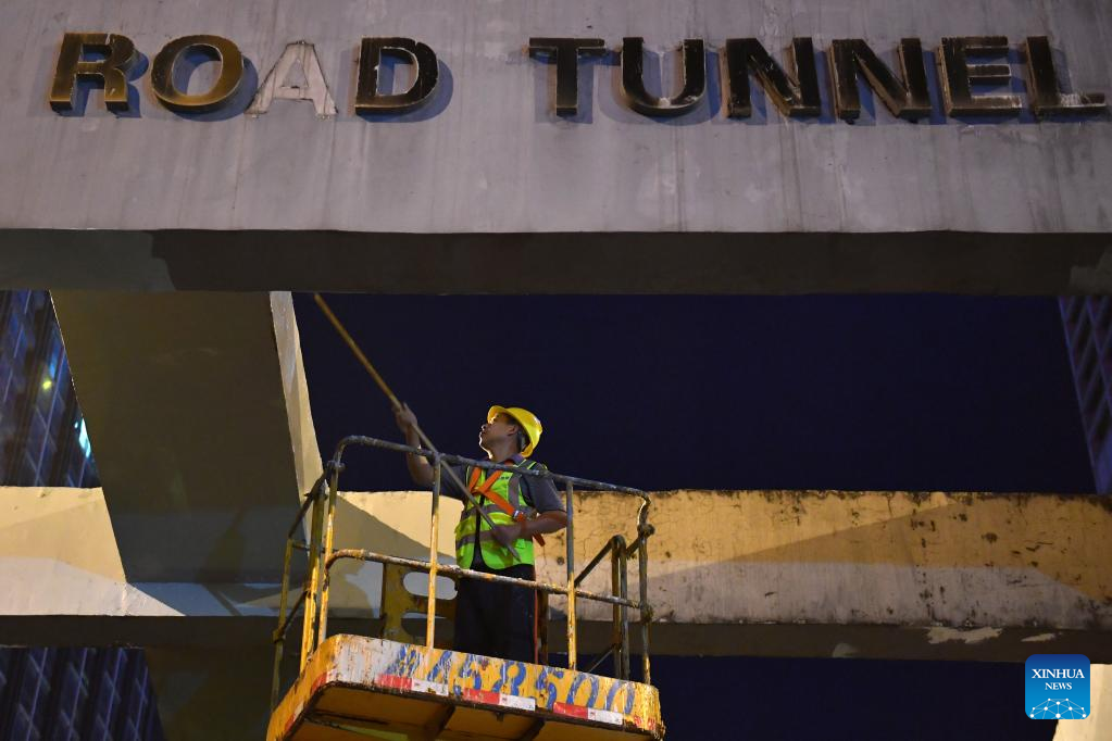 Workers conduct routine maintenance of Yingpan Road tunnel in Changsha, Hunan (2)