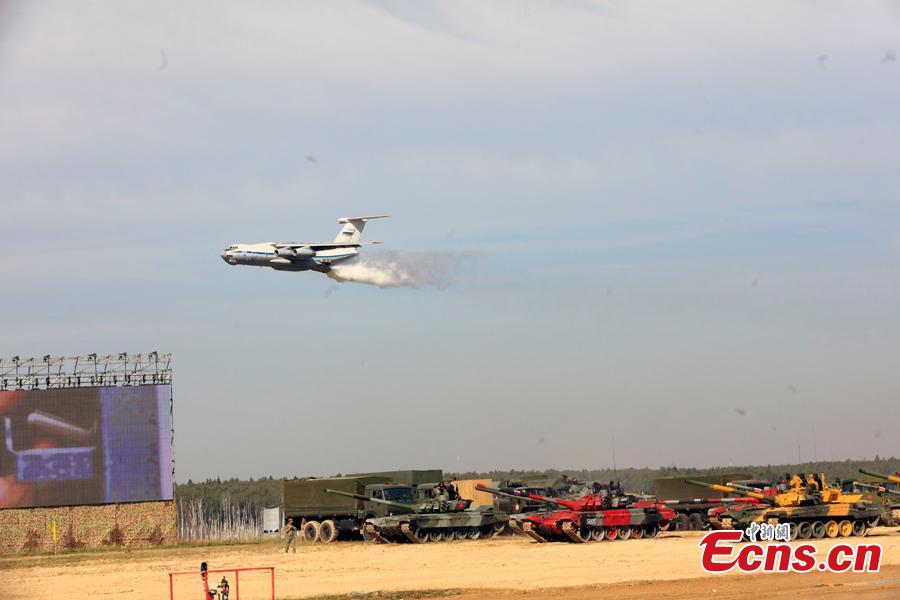 Tanks compete at "Tank Biathlon" contest of the "International Army Games - 2022" at the Alabino military training ground in Moscow, Russia, August 14, 2022. (Photo: China News Service/Tian Bing)