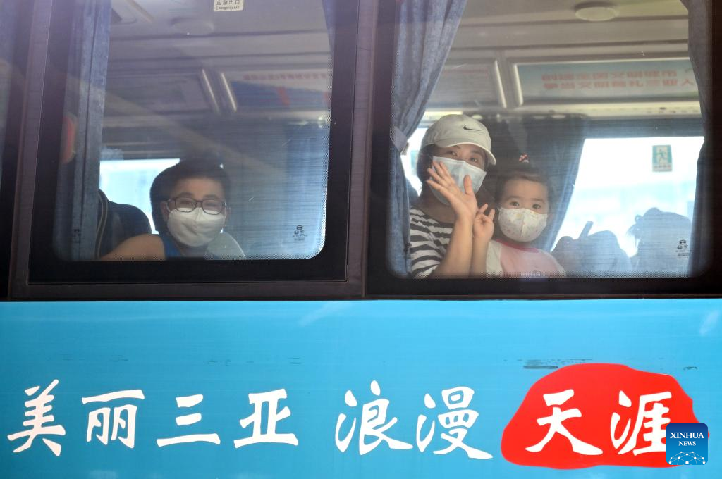 Tourists take a bus to the airport from a hotel in Sanya, south China's Hainan Province, Aug. 15, 2022. The commercial operation of domestic passenger flights have been gradually resumed at the Sanya Phoenix International Airport from Monday. (Xinhua/Guo Cheng)