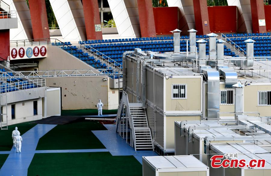 Drone photo shows a makeshift hospital built at a sports center in Lhasa, southwest China's Tibet Autonomous Region, Aug. 15, 2022. (Photo: China News Service/Li Lin)