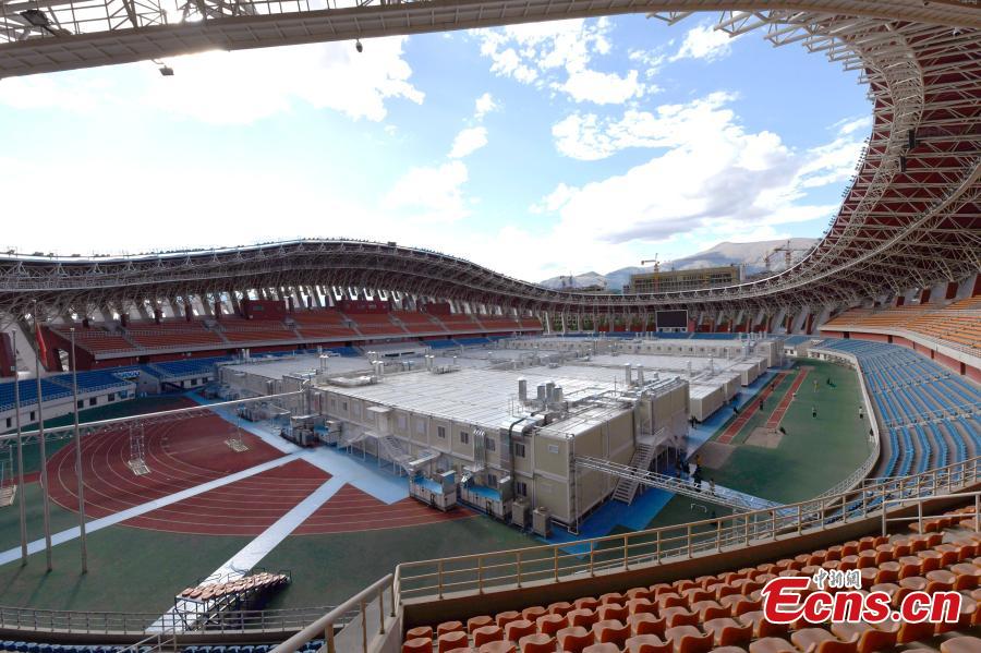 Drone photo shows a makeshift hospital built at a sports center in Lhasa, southwest China's Tibet Autonomous Region, Aug. 15, 2022. (Photo: China News Service/Li Lin)