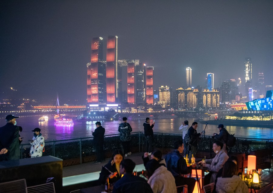 People enjoy the night view at a bar in southwest China's Chongqing Municipality, Dec. 8, 2021. Chongqing has adopted various activities to promote night economy. (Xinhua/Tang Yi)