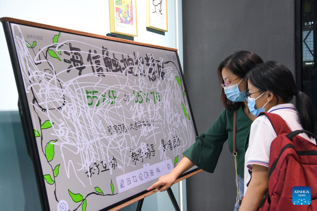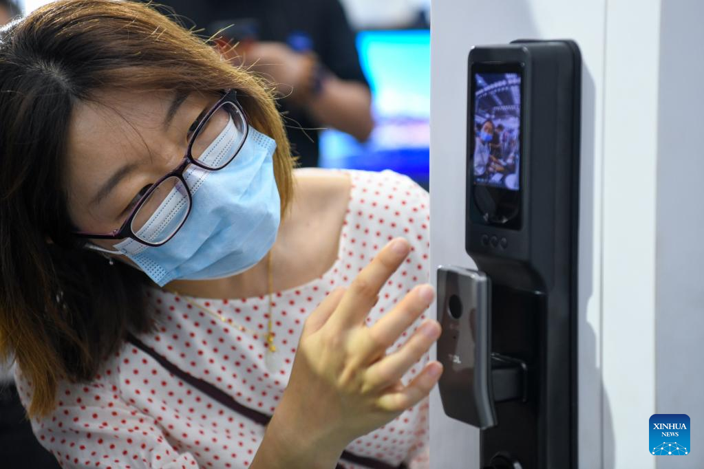 A visitor experiences a smart door lock at the 10th China Information Technology Expo in Shenzhen, south China's Guangdong Province, Aug. 17, 2022. (Xinhua/Liang Xu)