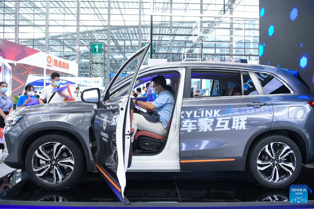 A visitor experiences an intelligent vehicle at the 10th China Information Technology Expo in Shenzhen, south China's Guangdong Province, Aug. 16, 2022. (Xinhua/Liang Xu)