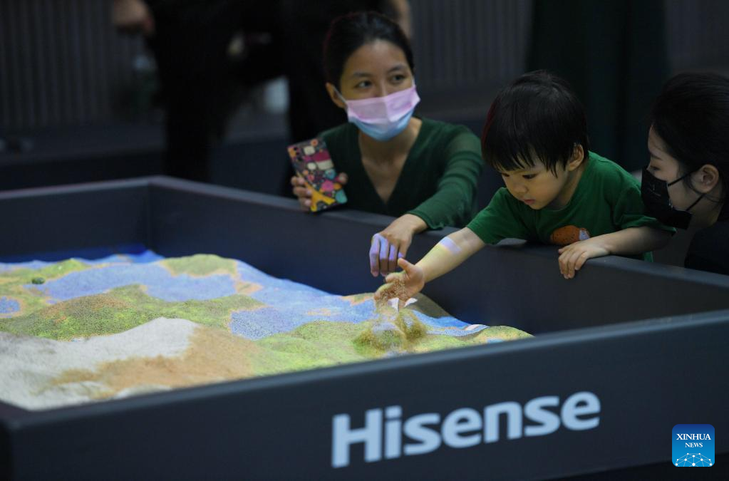 People visit a laser projection sand table at the 10th China Information Technology Expo in Shenzhen, south China's Guangdong Province, Aug. 16, 2022. (Xinhua/Mao Siqian)