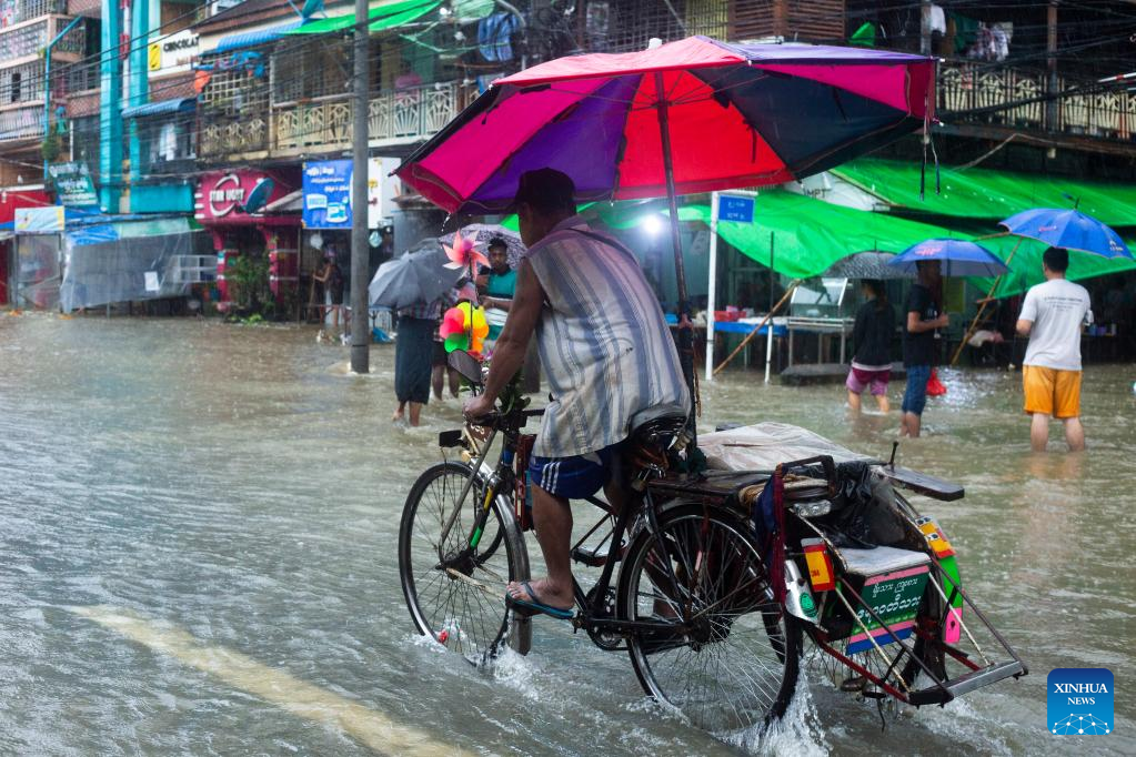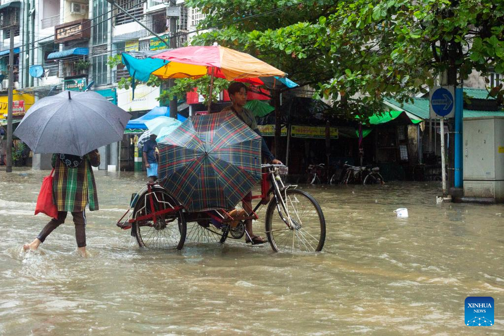 People wade through a flooded street after heavy rains in Yangon, Myanmar, Aug. 17, 2022. (Photo by Myo Kyaw Soe/Xinhua)
