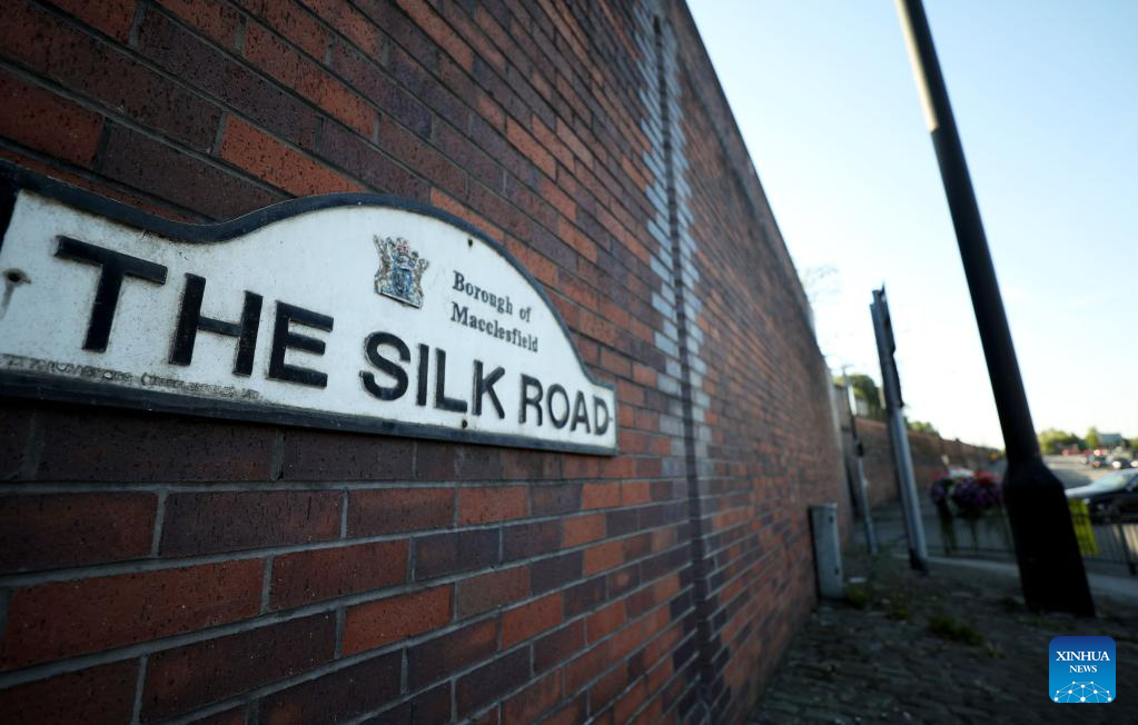 "THE SILK ROAD" sign is seen in Macclesfield, Britain, Aug. 11, 2022. The town of Macclesfield in northwest England was dubbed the "silk capital of England" in the 18th century, and now local entrepreneurs and artists are trying to keep this heritage alive. (Xinhua/Li Ying)