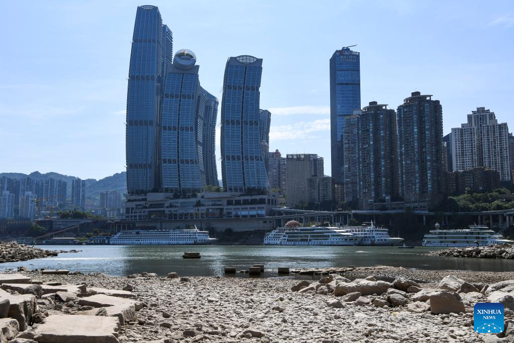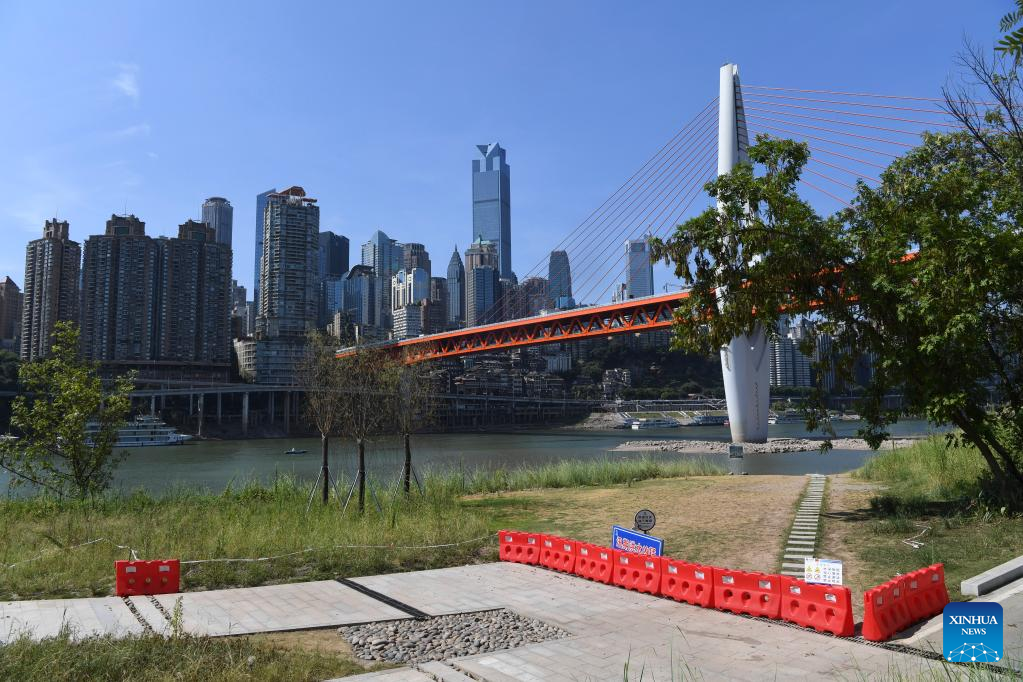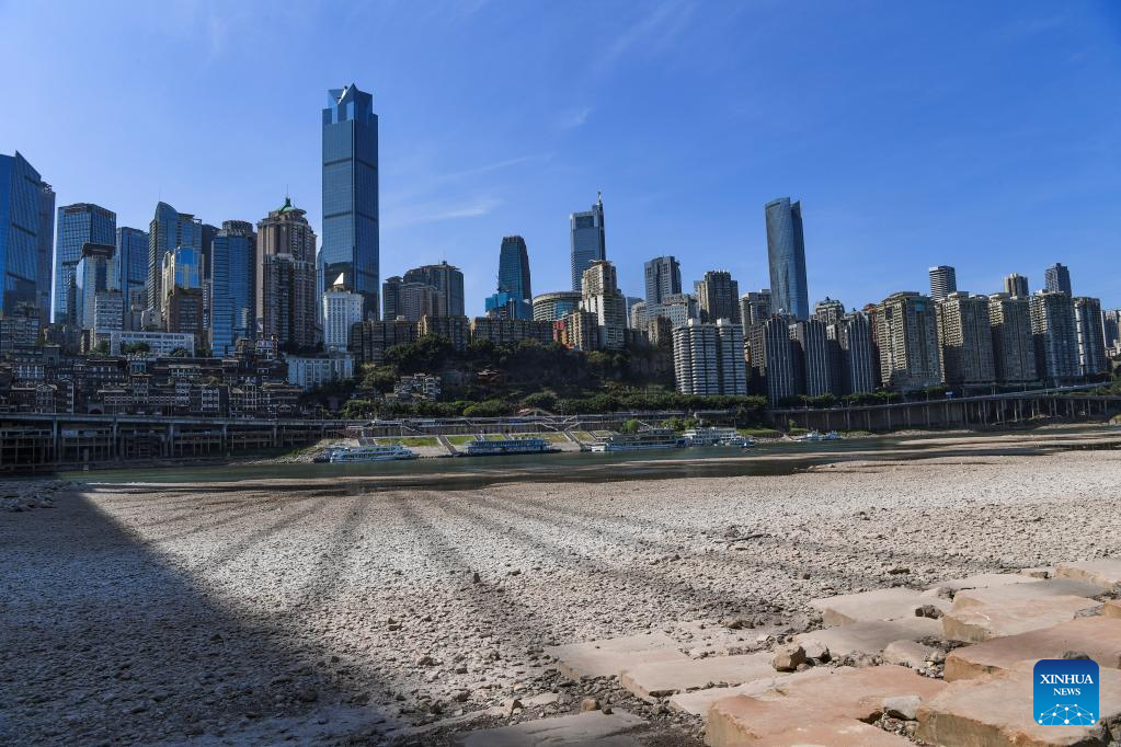 Due to the decrease of upstream water, continuous high temperature and less rainfall, the water level of Jialing River flowing through the main urban area of Chongqing has fallen significantly. (Xinhua/Wang Quanchao)