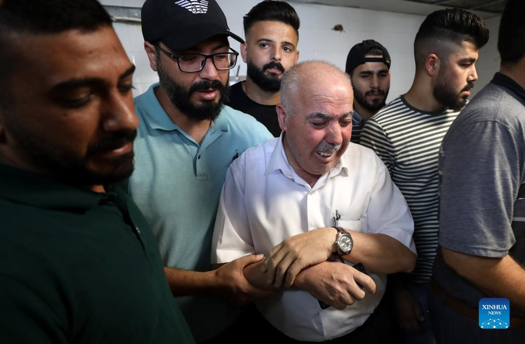 A relative of Palestinian Salah Sawafta mourns at a hospital in the West Bank city of Nablus, Aug. 19, 2022. Salah Sawafta, 58, died from critical injuries after being shot in the head by Israeli soldiers in the West Bank city of Tubas, the Palestinian health ministry said. (Photo by Ayman Nobani/Xinhua)
