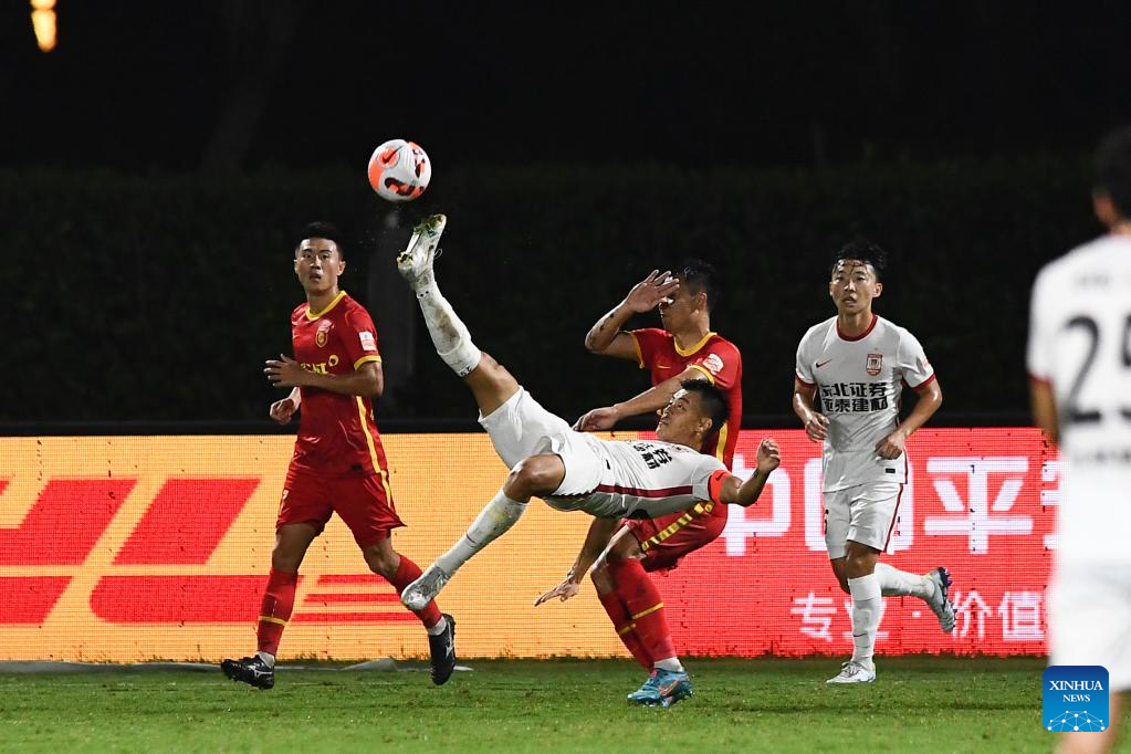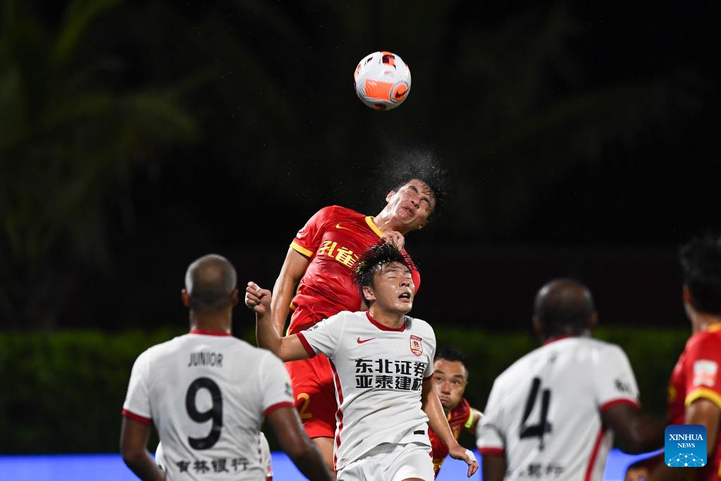 Ren Wei (above) of Hebei FC vies for a header during a 2022 season Chinese Football Association Super League (CSL) match between Hebei FC and Changchun Yatai in Haikou, south China's Hainan Province, Aug. 19, 2022. (Xinhua/Hu Zhixuan)