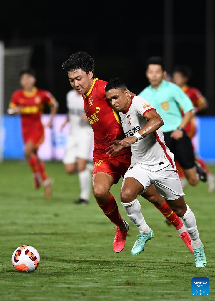 Erik (R) of Changchun Yatai vies the ball with Zhang Yu of Hebei FC during a 2022 season Chinese Football Association Super League (CSL) match between Hebei FC and Changchun Yatai in Haikou, south China's Hainan Province, Aug. 19, 2022. (Xinhua/Hu Zhixuan)